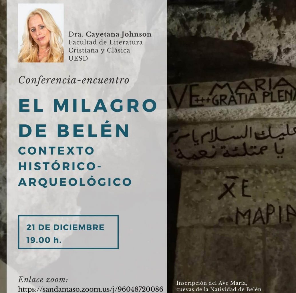 Disertará el próximo lunes 21 de diciembre a las 19.00h. sobre “El misterio de Belén. Contexto histórico-arqueológico” acercándonos al momento histórico y al lugar geográfico del nacimiento de Nuestro Señor Jesucristo. Posteriormente se abrirá un diálogo con los asistentes.