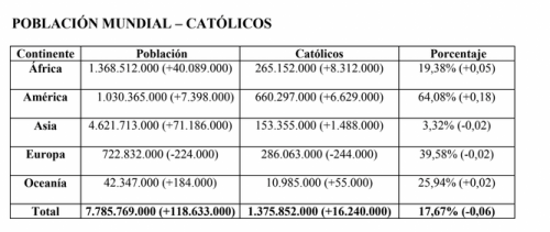 De todos modos, con una población mundial que alcanzó a fines de 2021 las 7.785.769.000 personas, con un aumento de 118.633.000 unidades respecto al año anterior, el porcentaje mundial de católicos disminuyó un 0,06% con respecto al año precedente.