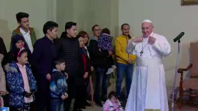 Francisco se reúne con los 33 refugiados acogidos en Roma gracias al limosnero y a la Comunidad de Sant’Egidio.