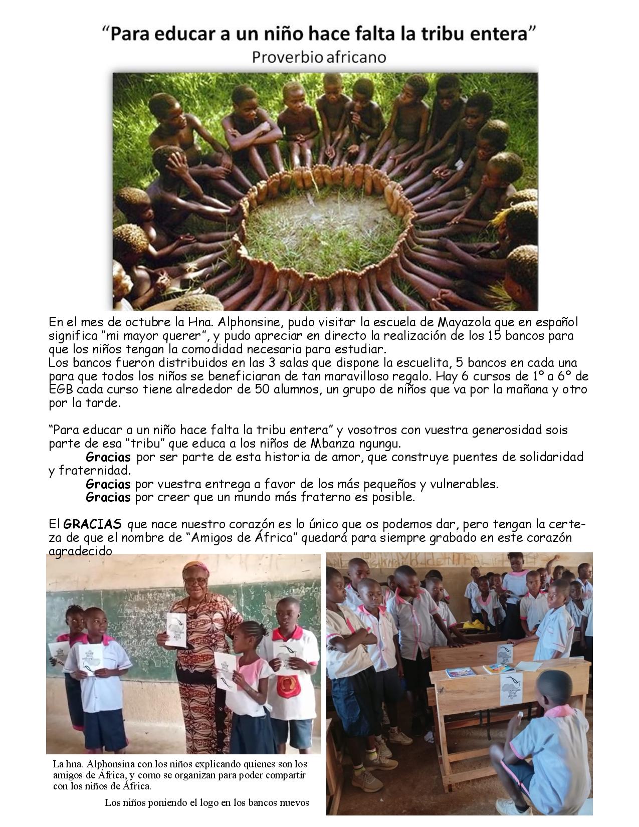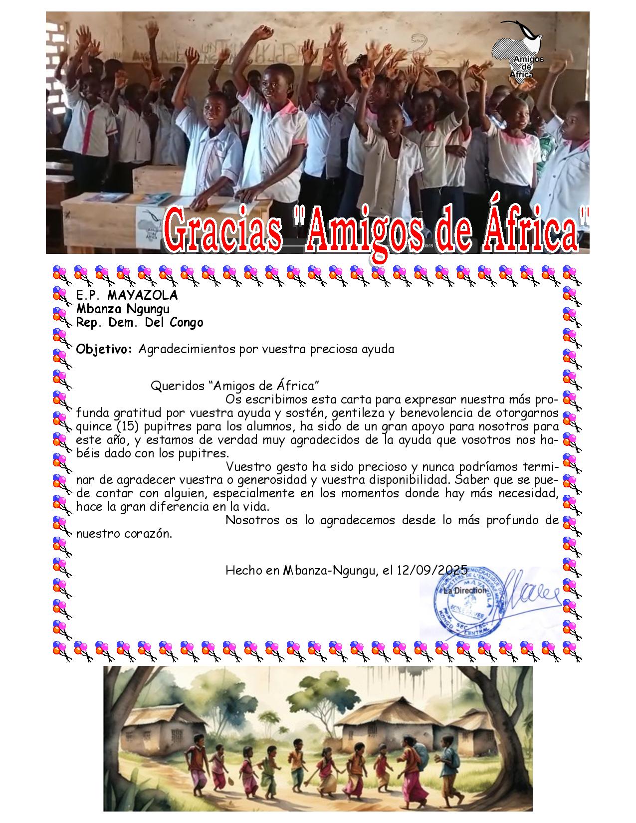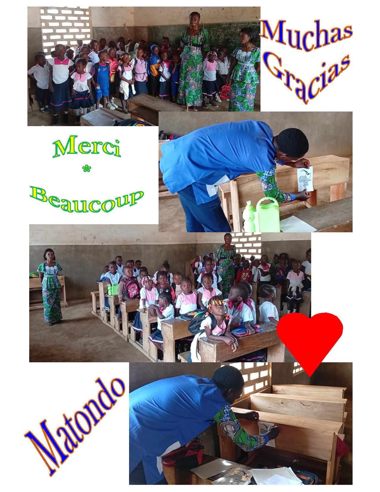 Os escribimos esta carta para expresar nuestra más profunda gratitud por vuestra ayuda y sostén, gentileza y benevolencia de otorgarnos quince (15) pupitres para los alumnos, ha sido de un gran apoyo para nosotros para este año, y estamos de verdad muy agradecidos de la ayuda que vosotros nos habéis dado con los pupitres.