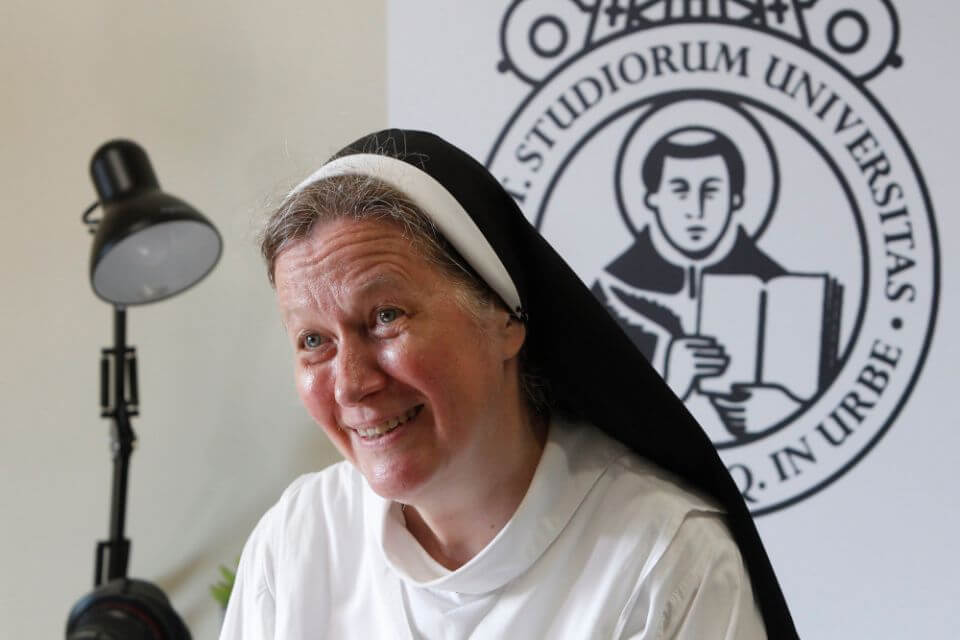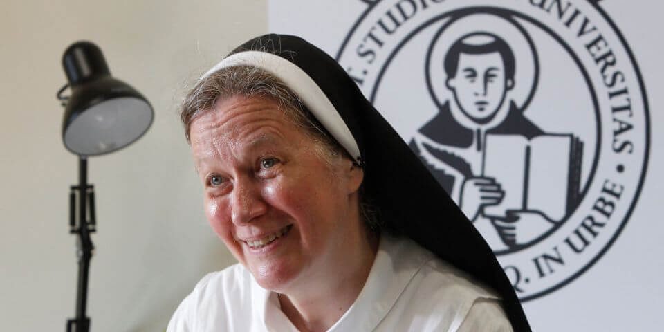 La dominica Hna. Helen Alford, vicerrectora de la Pontificia Universidad de Santo Tomás de Aquino de Roma, da una entrevista en la universidad el 10 de septiembre de 2020. Alford es el miembro más nuevo de la Pontificia Academia de Ciencias Sociales. (CNS / Robert Duncan)
