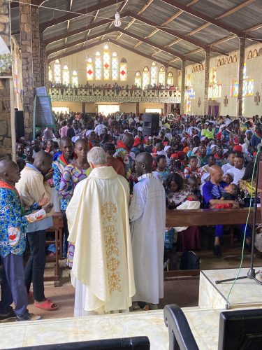 ¡Qué alegría participar en esta celebración donde estaba representada toda la Diócesis! ¡Qué dinamismo de esa enorme «masa» de fieles cantando al unísono y con viva emoción! He de reconocer que me estoy oxigenando; ¡me estaba haciendo falta! A pesar de las 4 horas que duró la Eucaristía. Esas manifestaciones muestran una vivencia de la Fe en el día a día de estas gentes: muchos grupos de jóvenes y niños tuvieron que hacer muchos kilómetros para participar, pues las carreteras, por llamarlas de una manera «noble», no están para autobuses aún… Y, a pesar de la situación de inseguridad, algo confusa en los pueblos, la gente sigue el camino de la Vida; quieren vivir y lo hacen con una gran emoción.