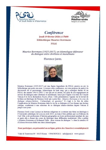 Una tesis doctoral en teología ha sido defendida en abril 2025 sobre la vida y el compromiso con el diálogo islamo-cristiano del padre blanco Maurice Borrmans (1925-2017). Ahora, una conferencia pública tendrá lugar el 19 de febrero de 2026 en el Instituto Pontificio de Estudios Árabes e Islamicos (PISAI) donde enseñó mas de 40 años. Se podrá asistir a la conferencia de la Pr. Florence Javel, titulada «Maurice Borrmans, un islamólogo defensor del diálogo entre cristianos y musulmanes», a través de la redes sociales : sólo es necesario inscribirse antes eventi@pisai.it