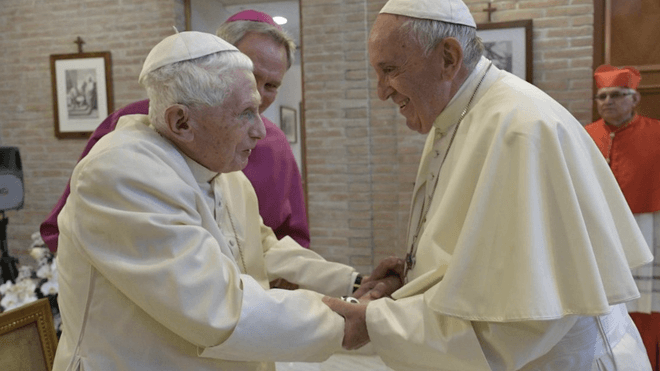 Lo anunciaba en la audiencia de este miércoles 28 de diciembre el Papa Francisco. Y no, no era una inocentada: Benedicto XVI estaba «muy mal». A las 9,34 horas de hoy, el Papa emérito, el primero en la historia de la Iglesia moderna, fallecía en su residencia del monasterio Mater Ecclesia a los 95 años, en un proceso degenerativo provocado por la edad. Bergoglio pudo visitarle antes de fallecer. Estuvo acompañado por su fiel secretario Georg Gänswein, y por las ‘Memore domini’ que lo cuidaban desde que, el 28 de febrero de 2013, hacía efectiva su retirada.