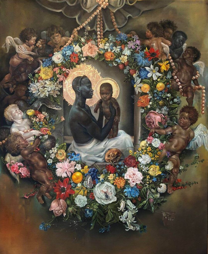 Harmonia Rosales es una pintora estadounidense, de origen afrocubano, que ha resignificando obras clásicas de la pintura occidental, sobre todo del Renacimiento poniendo en el centro el empoderamiento de la mujer negra y de la diáspora. En sus obras le da la vuelta a obras como El nacimiento de Adán de Miguel Ángel o a El nacimiento de Venus de Boticelli para que veamos en el centro de sus lienzos a mujeres negras. Porque, ¿Quién dijo que Dios no podía ser una mujer y negra?
