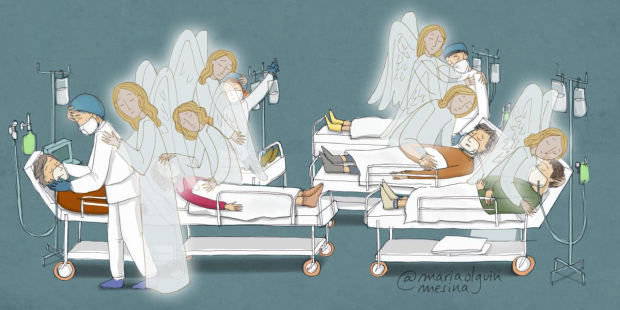 «Al hacer estos dibujos, quería mostrar que el Señor está con nosotros», dice Aleteia María Olguín, esta ilustradora de Asturias (noroeste de España) cuyos dibujos han molestado a muchos usuarios de Internet. En solo unos días, su dibujo de varios ángeles ocupados con pacientes de covid-19 se compartió masivamente en el lienzo. Los cuidadores han comenzado a publicarlo en sus perfiles de Whatsapp.