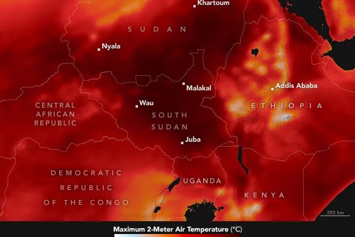 El calor opresivo en Sudán del Sur superó los 37°C, el máximo promedio durante la estación seca. Algunos residentes de la capital, Juba, soportaron el calor sin ventiladores eléctricos porque el aumento de la demanda provocó cortes de energía. Según informes de prensa, en el país se reportaron incidentes de muerte debido al calor excesivo.